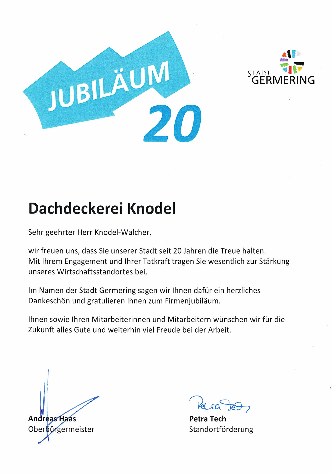 Die Stadt Germering gratuliert zum 20-jährigen Firmenjubiläum